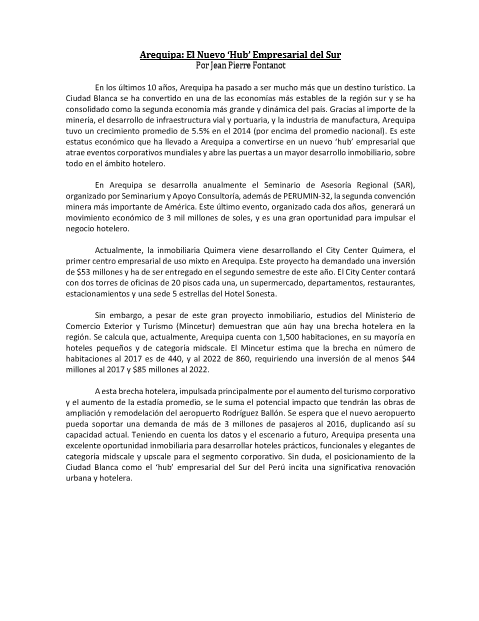 En los últimos 10 años, Arequipa ha pasado a ser mucho más que un destino turístico. La Ciudad Blanca se ha convertido en una de las economías más estables de la región sur y se ha consolidado como la segunda economía más grande y dinámica del país. Gracias al importe de la minería, el desarrollo de infraestructura vial y portuaria, y la industria de manufactura, Arequipa tuvo un crecimiento promedio de 5.5% en el 2014 (por encima del promedio nacional). Es este estatus económico que ha llevado a Arequipa a convertirse en un nuevo ‘hub’ empresarial que atrae eventos corporativos mundiales y abre las puertas a un mayor desarrollo inmobiliario, sobre todo en el ámbito hotelero.