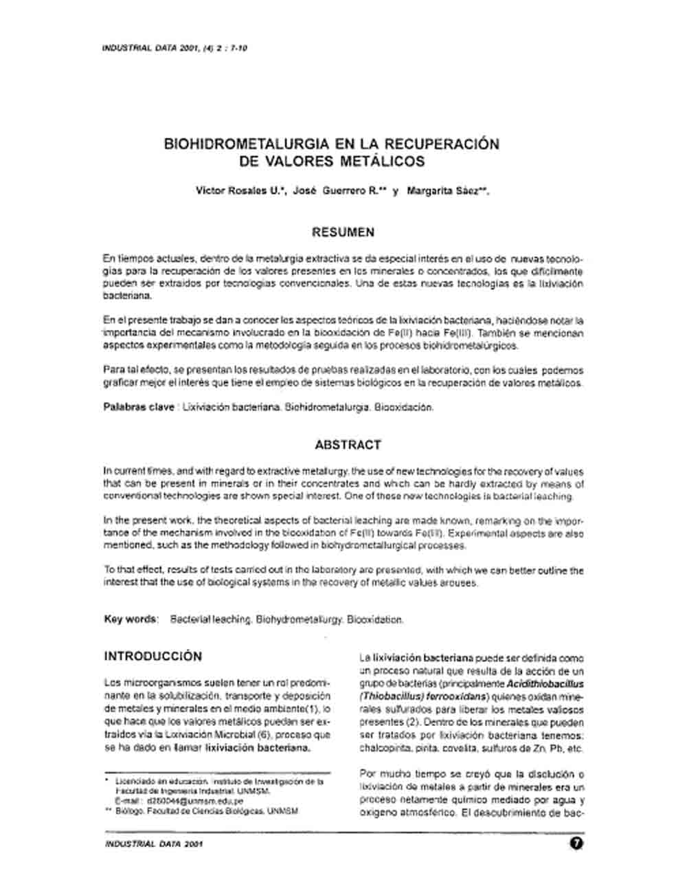 En los tiempos actuales, dentro de la metalurgia extractiva se da especial interés en el uso de nuevas tecnologías para la recuperación de los valores presentes en los minerales o concentrados, los que difícilmente pueden ser extraídos por tecnologías convencionales. Una de estas nuevas tecnologías es la lixiviación bacteriana.