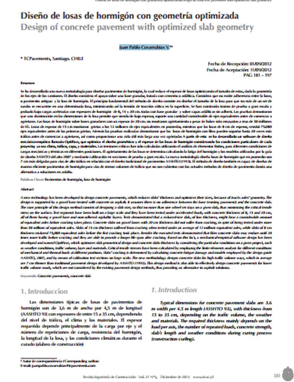 Se ha desarrollado una nueva metodología para diseñar pavimentos de hormigón, la cual reduce el espesor de losas optimizando el tamaño de estas, dada la geometría de los ejes de los camiones. El diseño considera el apoyo sobre una base granular, tratada con cemento o asfáltica.