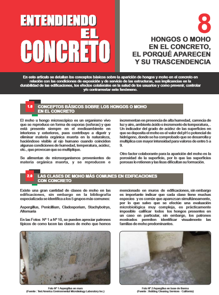 En este artículo se detallan los conceptos básicos sobre la aparición de hongos y moho en el concreto en relación con las condiciones de exposición y de servicio de las estructuras, sus implicancias en la durabilidad de las edificaciones, los efectos colaterales en la salud de los usuarios y como prevenir, controlar y/o contrarrestar este fenómeno.