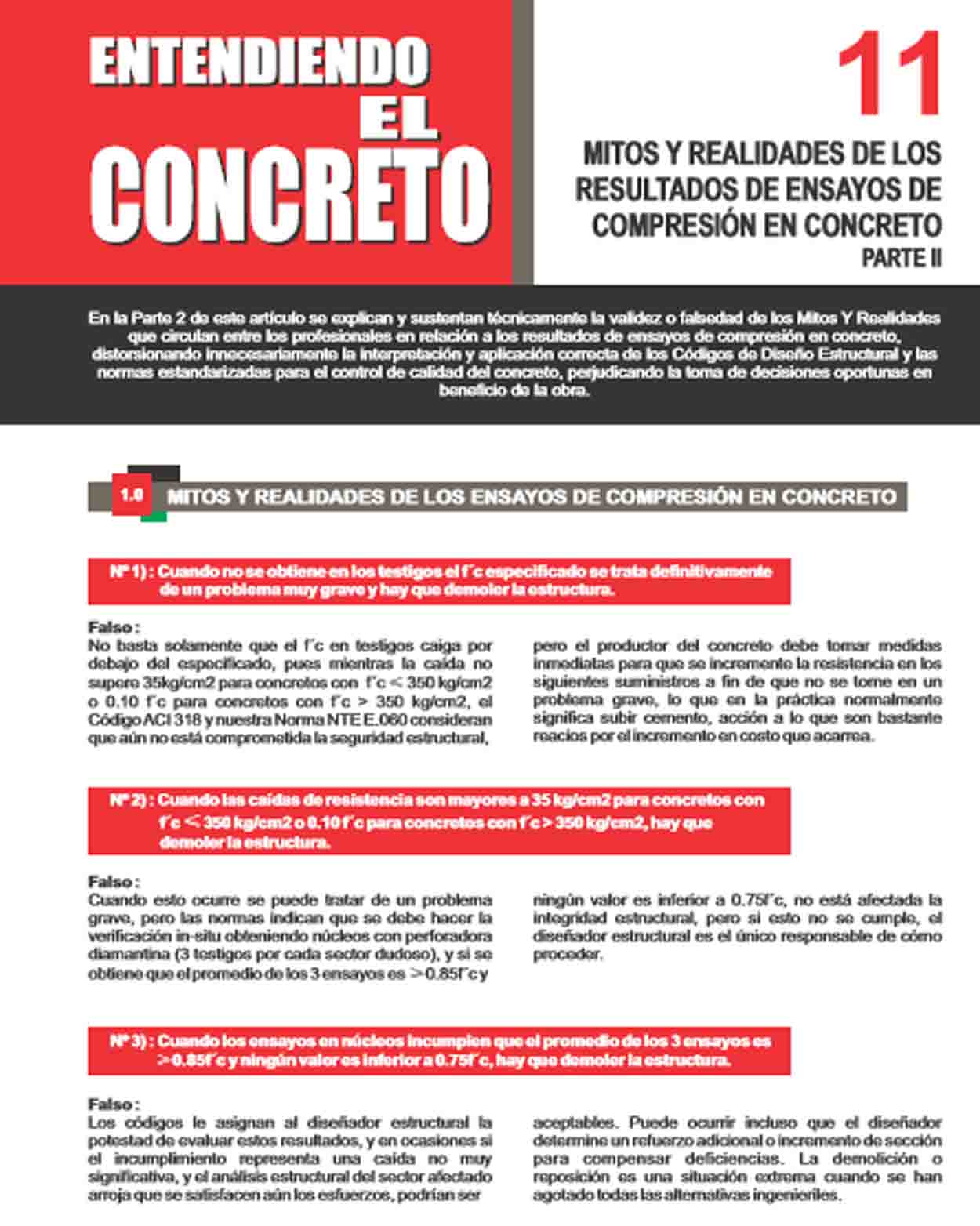 En la Parte 2 de este artículo se explican y sustentan técnicamente la validez o falsedad de los Mitos Y Realidades que circulan entre los profesionales en relación a los resultados de ensayos de compresión en concreto, distorsionando innecesariamente la interpretación y aplicación correcta de los Códigos de Diseño Estructural y las normas estandarizadas para el control de calidad del concreto, perjudicando la toma de decisiones oportunas en beneficio de la obra.
